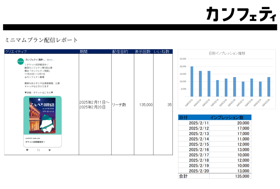 ミニマムプラン・スタンダードプランの配信結果は、配信期間終了後にレポートでご報告。総表示回数など、広告効果がしっかり確認できます。